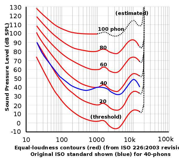주파수 별 느끼는 음압의 세기를 나타낸 "등청감곡선" 이라는 것이 있습니다.